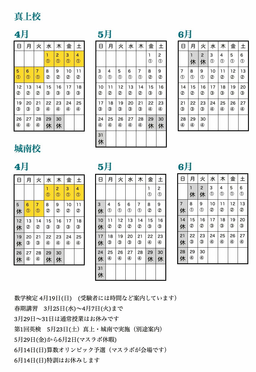 ・春期講習:3月25日(水)〜4月7日(火)